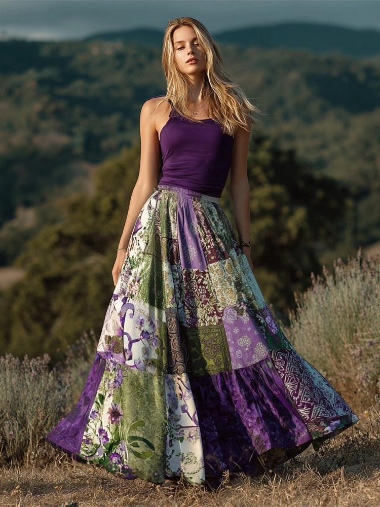 Boho Purple Patchwork Floral Pattern Women's Linen Half-length Skirt