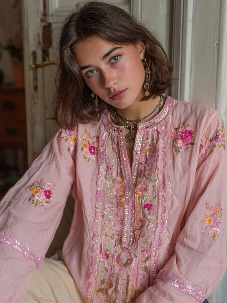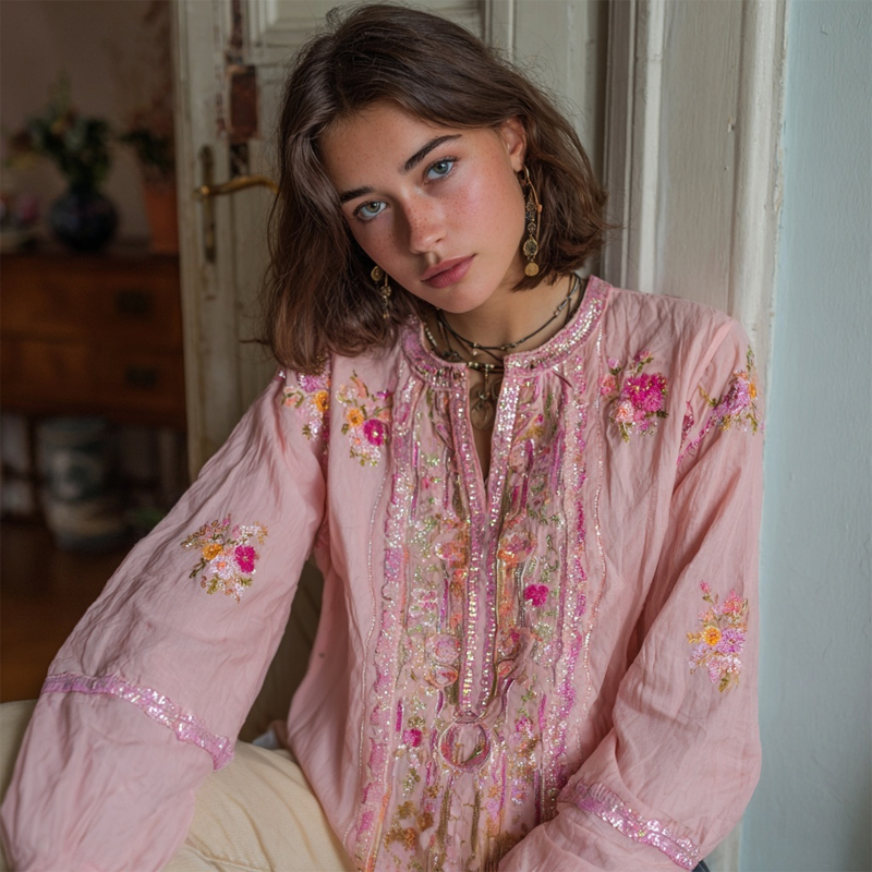 Elegant Flowers Embroidered Glitter Cozy Linen Shirt