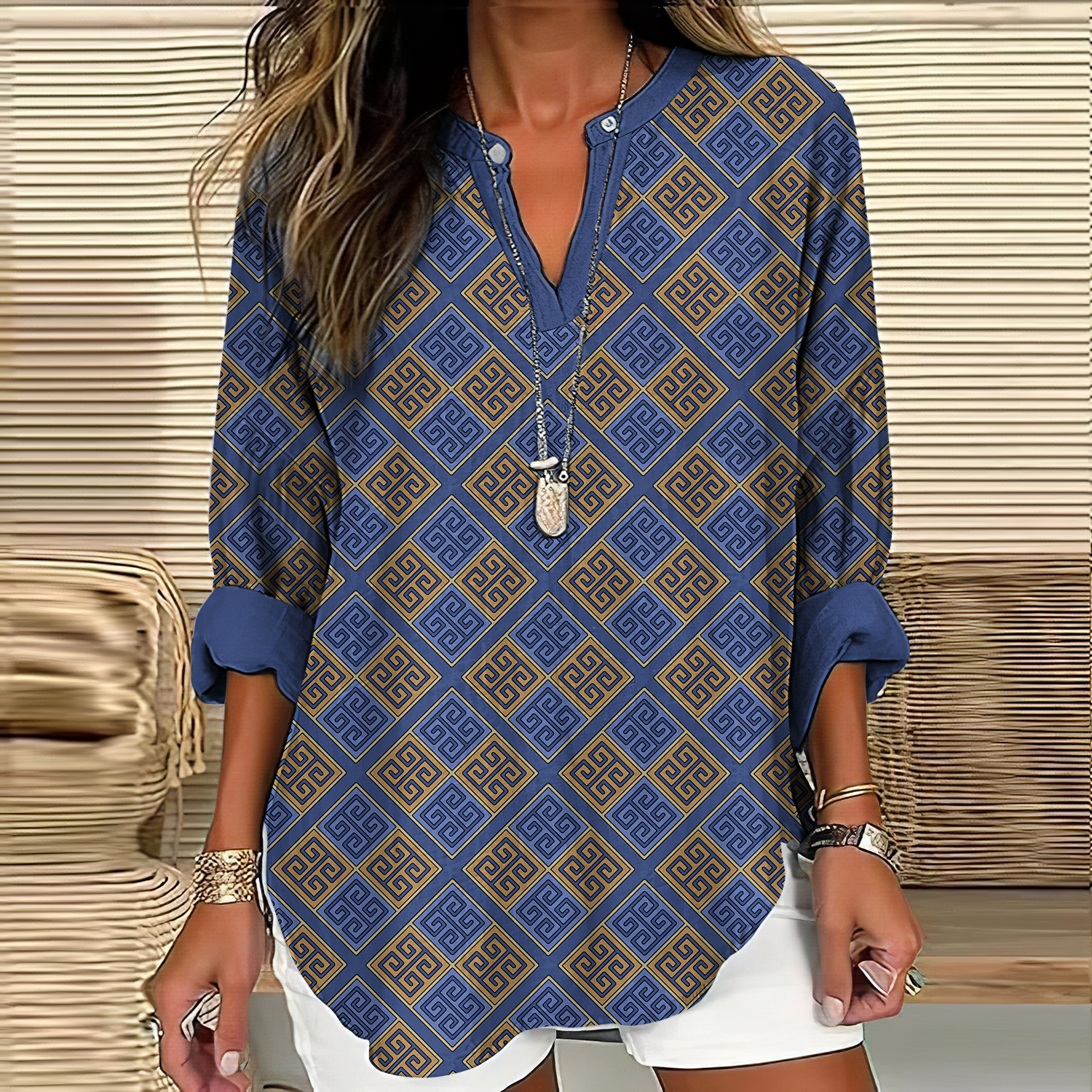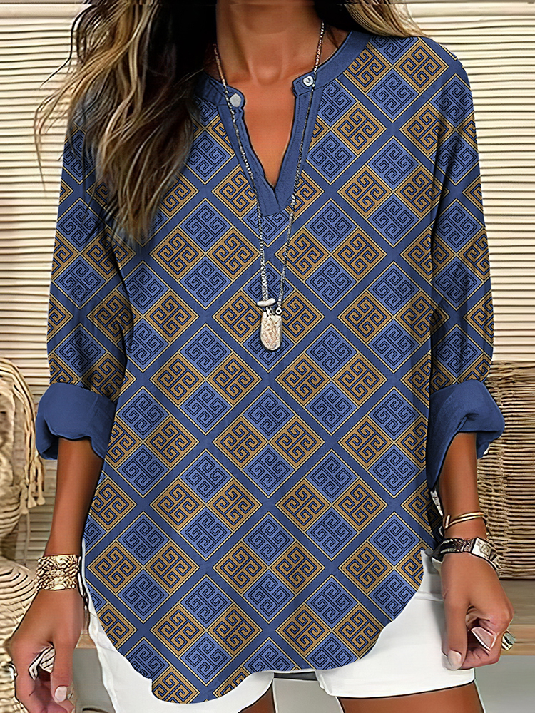 Greek Key Print V-neck Linen Blend Blouse