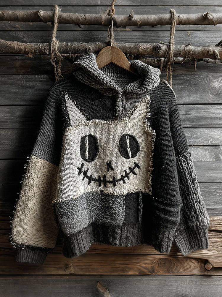Halloween Cat Spooky Face Contrast Stitched Cozy Knit Hooded Sweater
