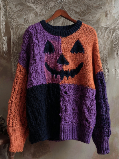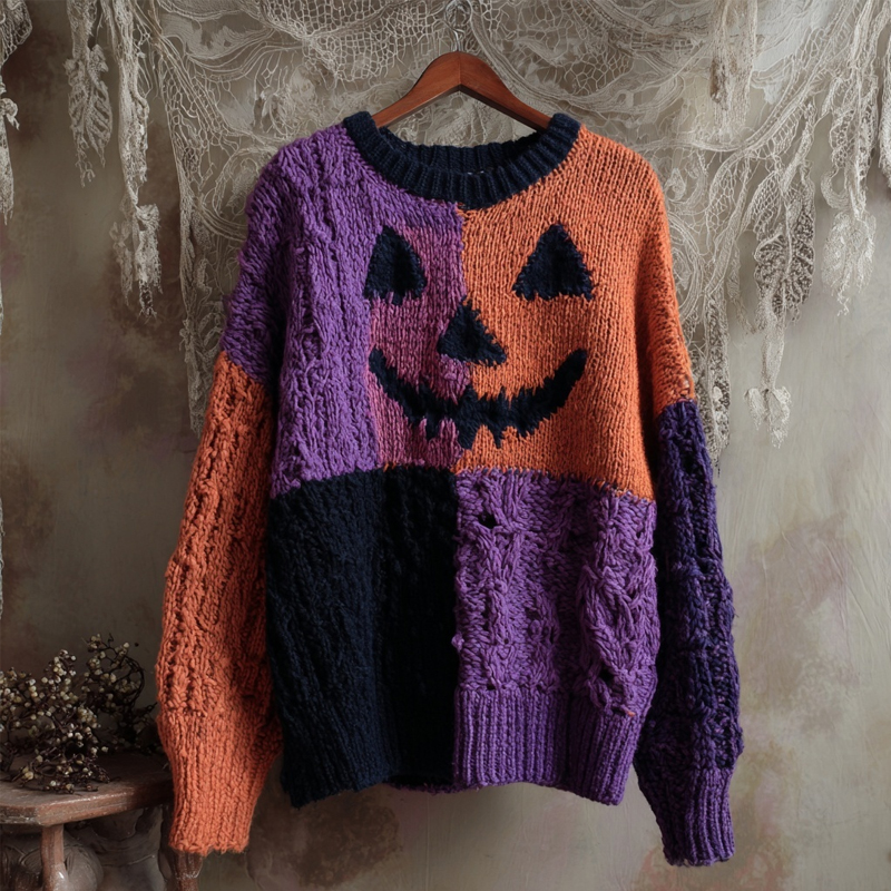 Halloween Pumpkin Face Colorblock Patchwork Knitted Sweater