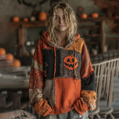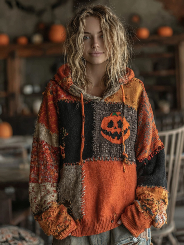 Halloween Pumpkin Patchwork Stitched Cozy Knit Hooded