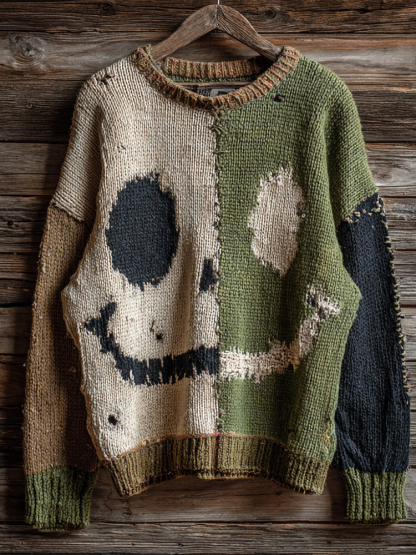 Halloween Spooky Face Contrast Stitching Cozy Crew Neck Knitted Sweater