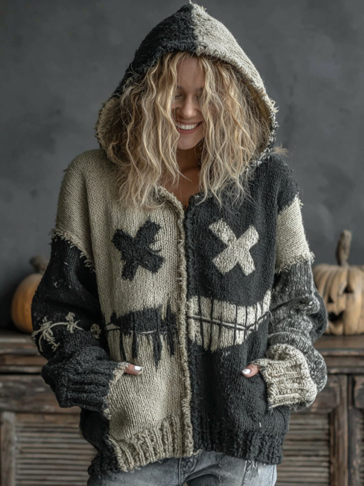 Halloween Spooky Face Patchwork Art Cozy Knit Hooded Cardigan