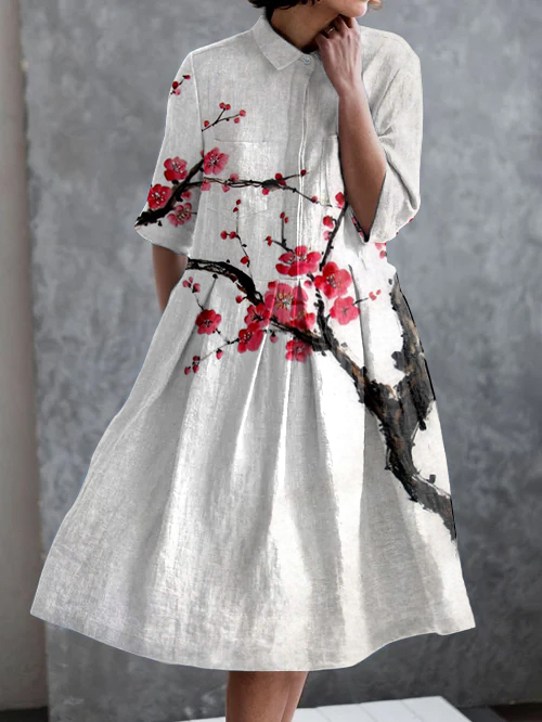 Japanese Art Print Casual Pocket Short Sleeve Dress