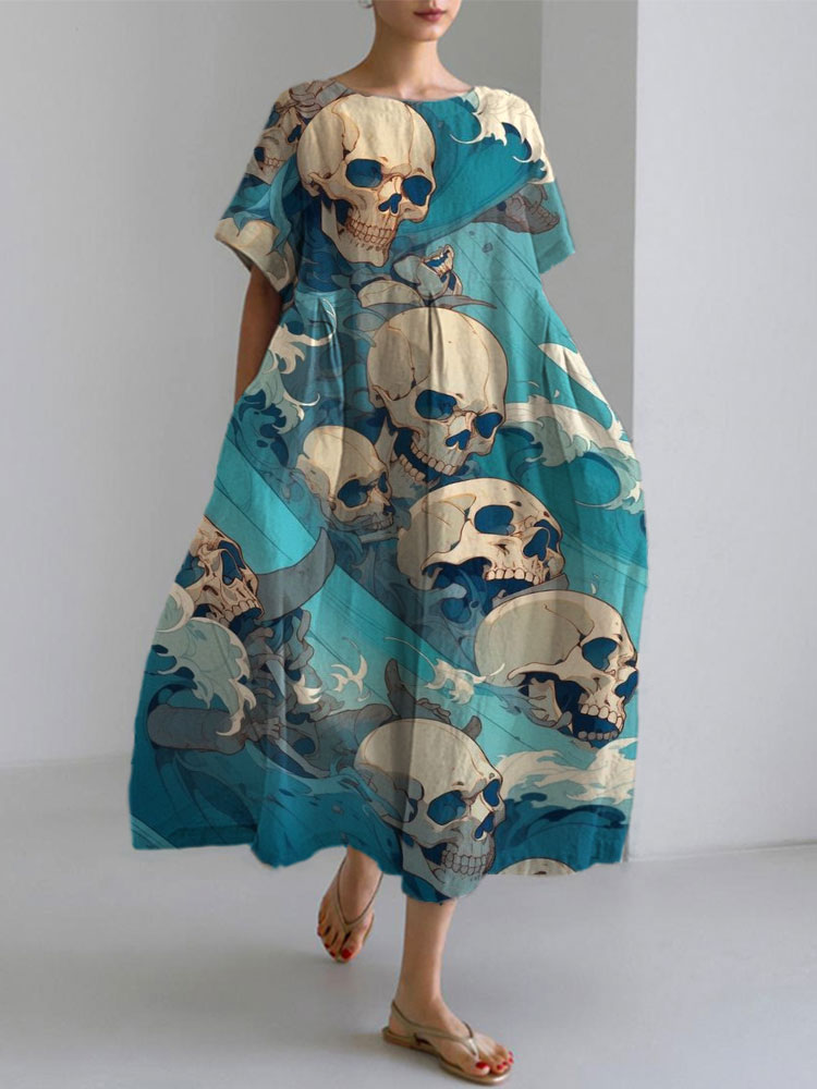 Japanese Art Skull Head Ocean Print Cotton Blend Dress
