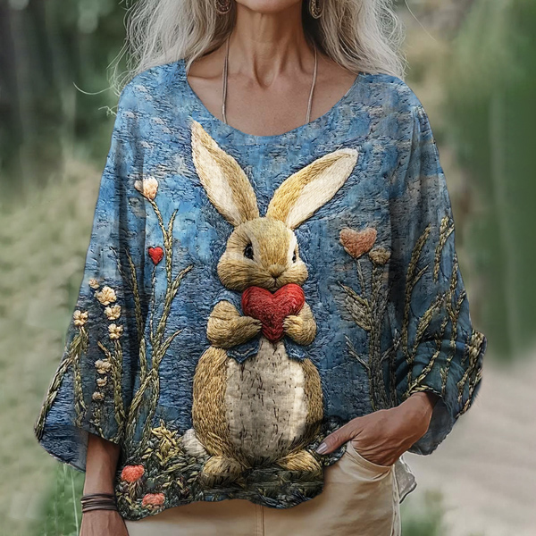 Love Bunny Animal Embroidery Women's Linen Loose Shirt