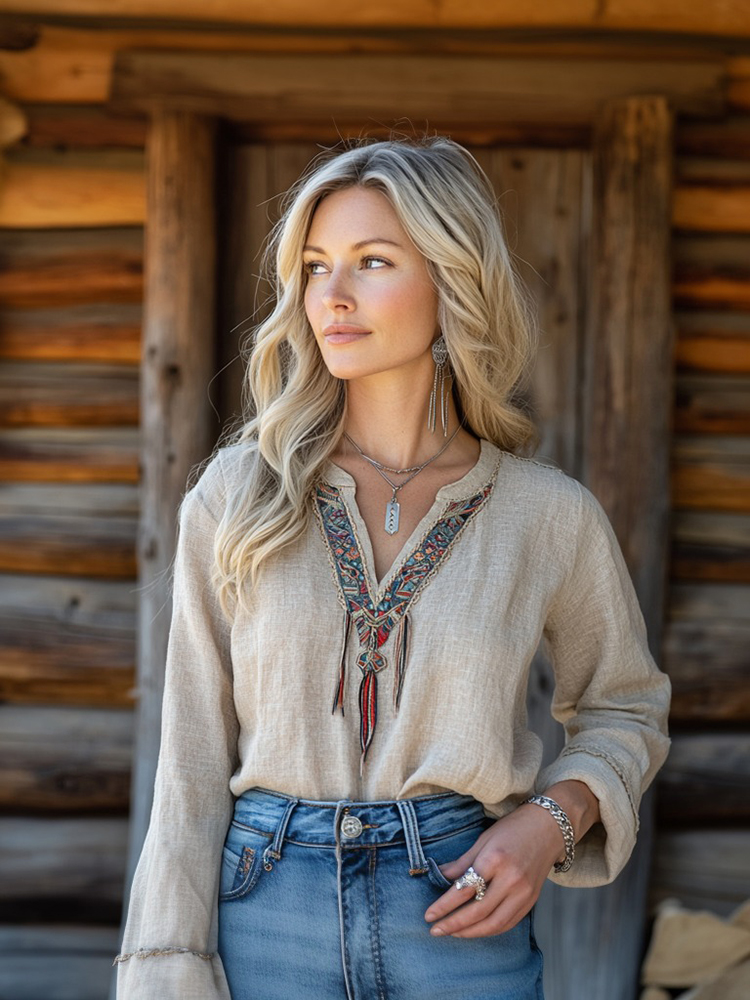 Boho Ethnic Embroidery Tassel Art Linen Blend Casual Blouse