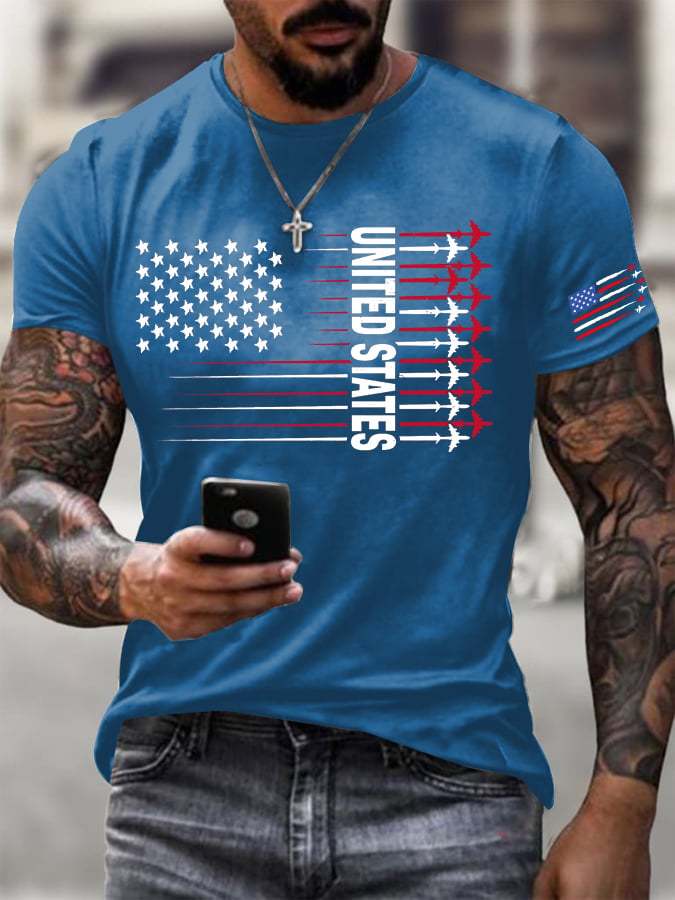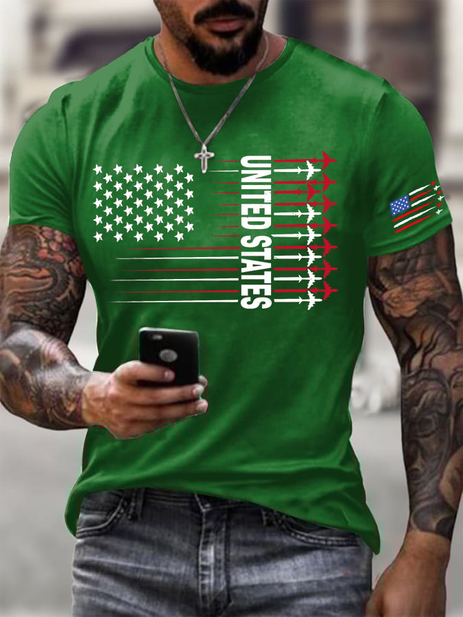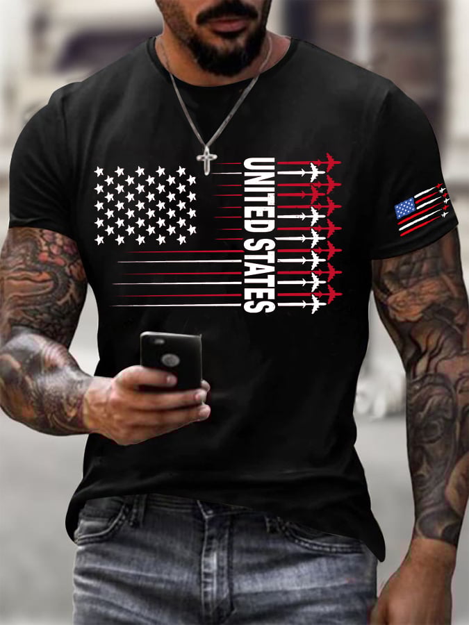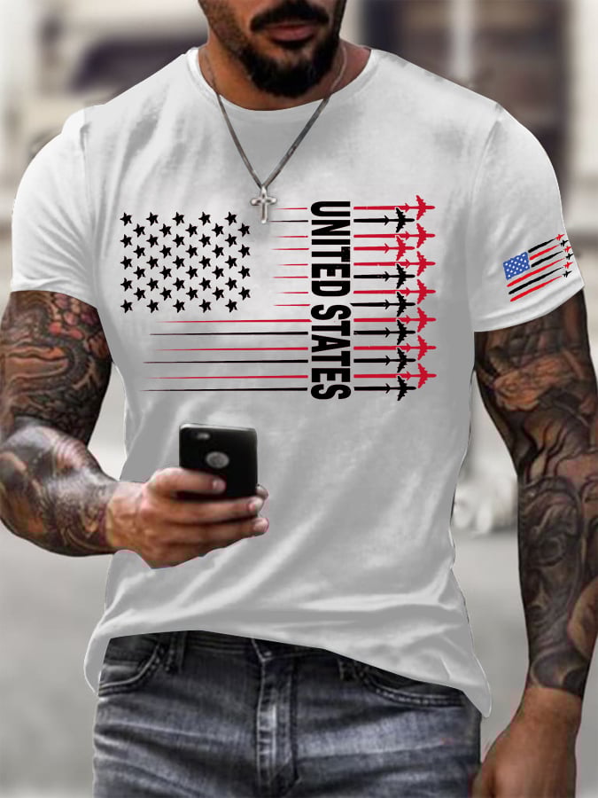 Men's American Flag Jet Fighter Printed Round Neck T-Shirt