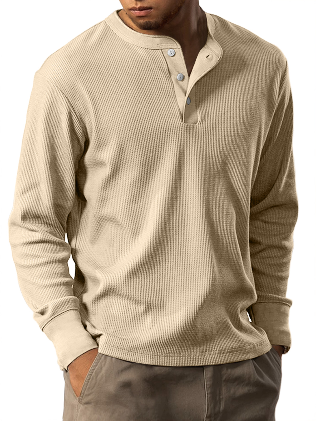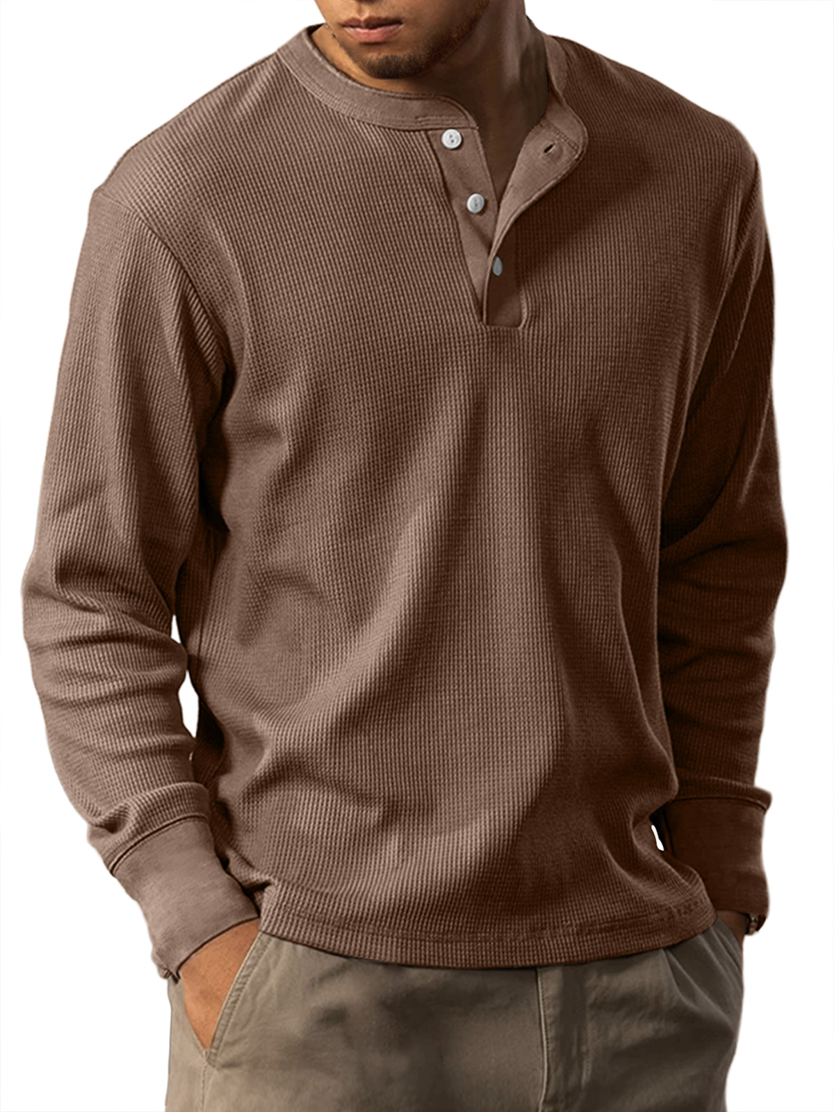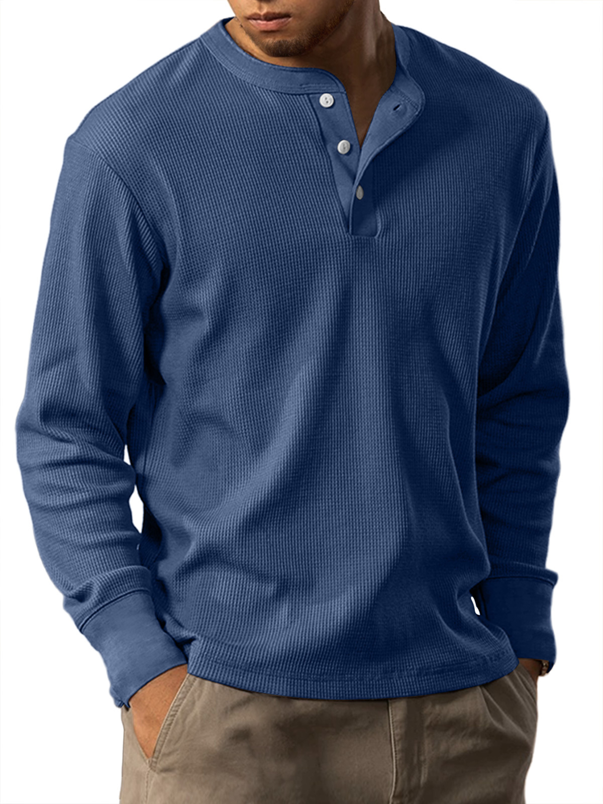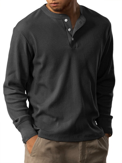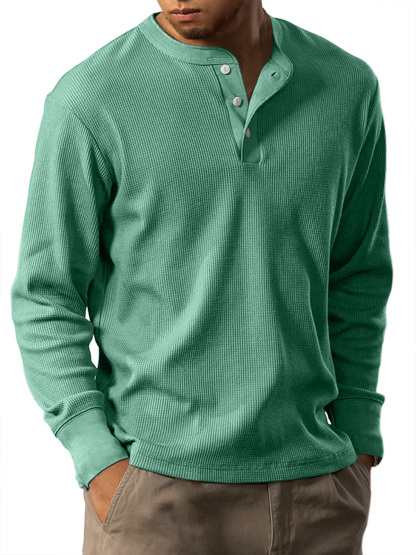 Men's Casual Waffle Solid Color Button Down Long Sleeve Henley