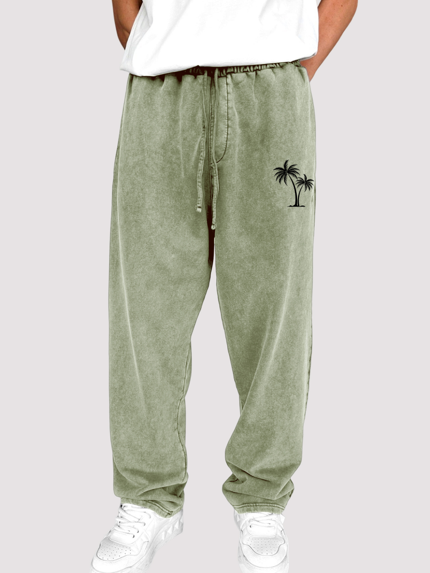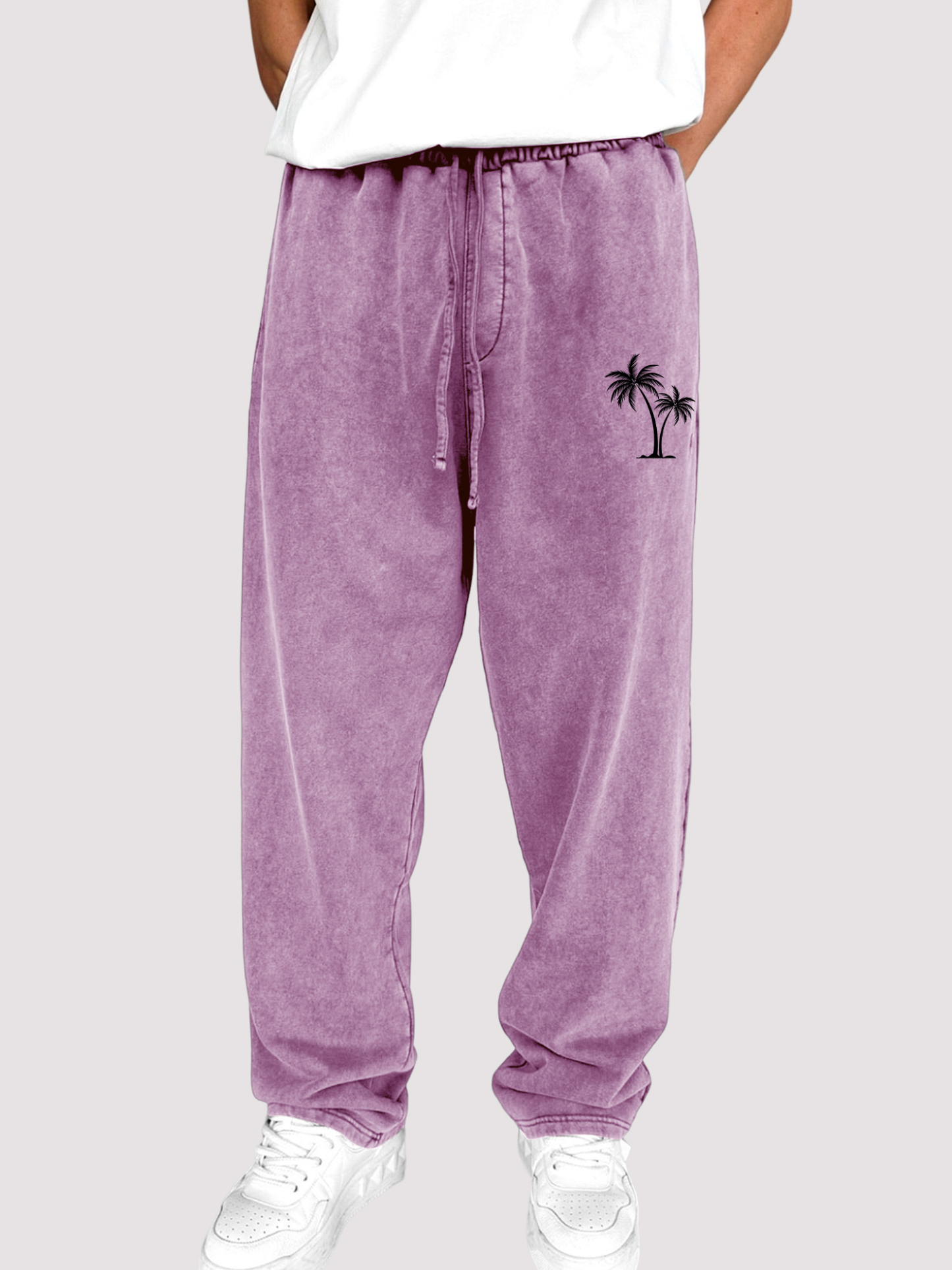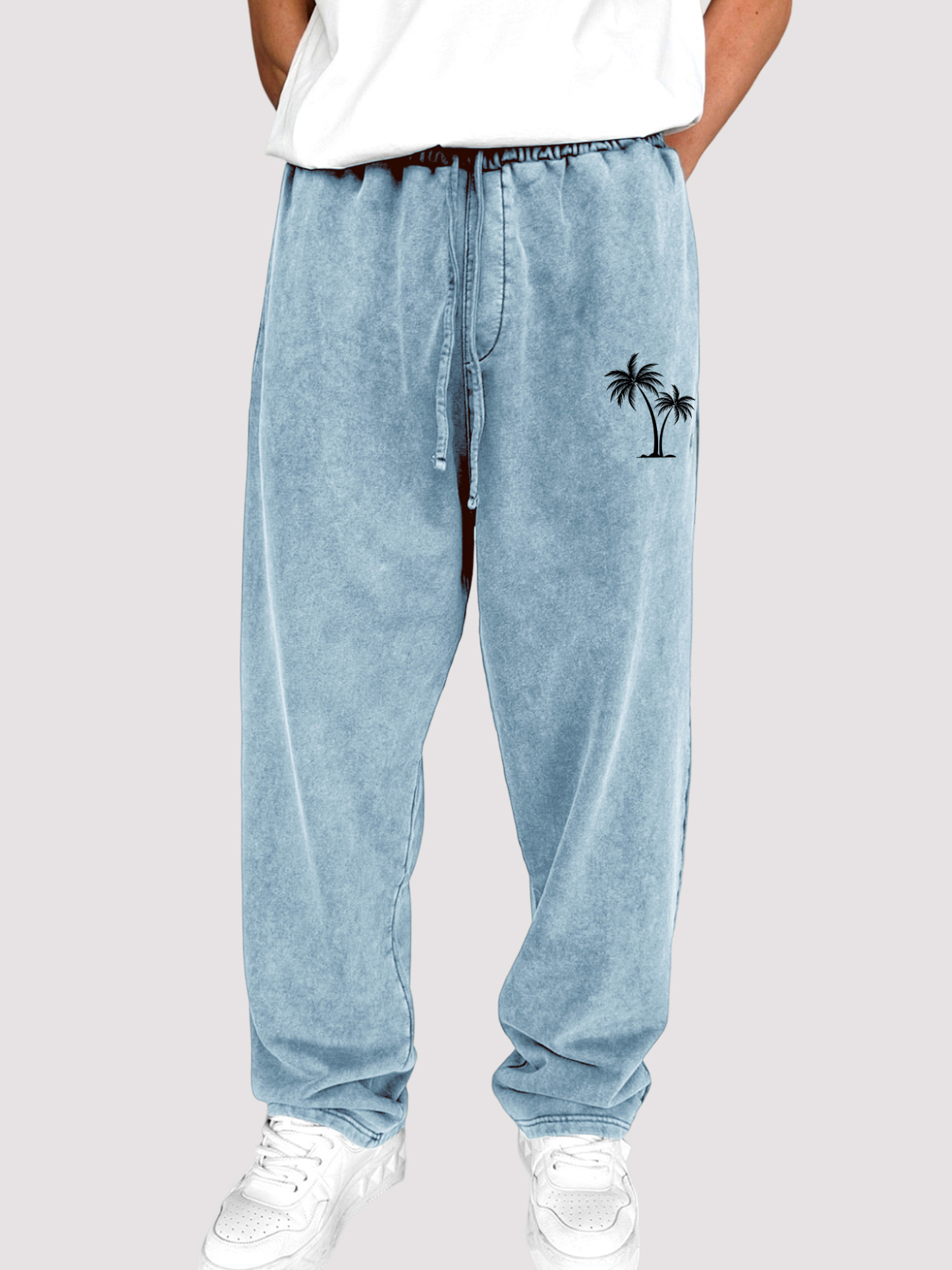 Men's Dyed Vintage Coconut Tree Printed Holiday Casual Elastic Waist Drawstring Trousers