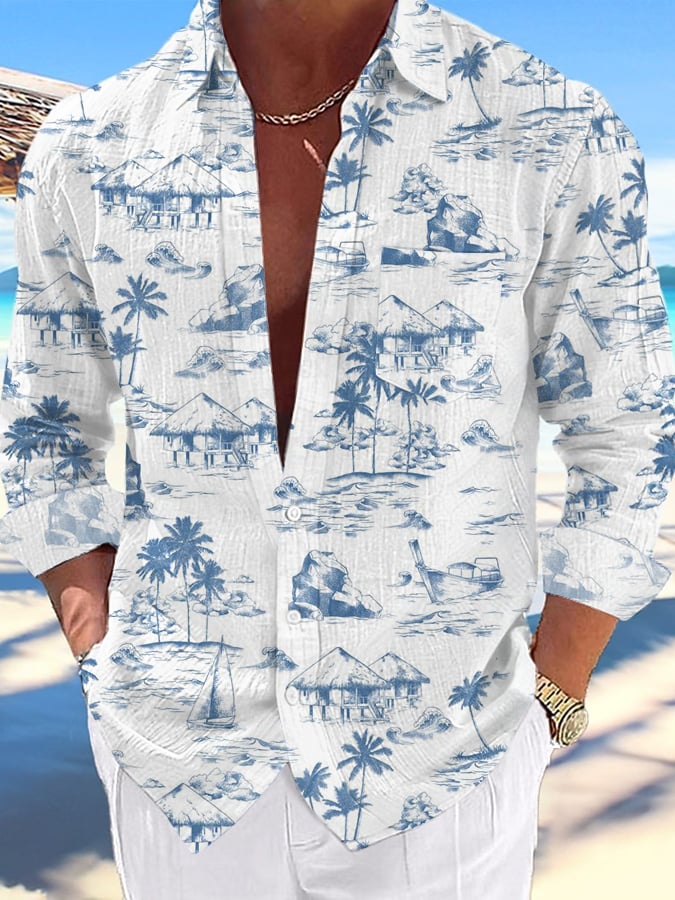 Men's Hawaiian Palm Tree Print Long Sleeve Pocket Shirt