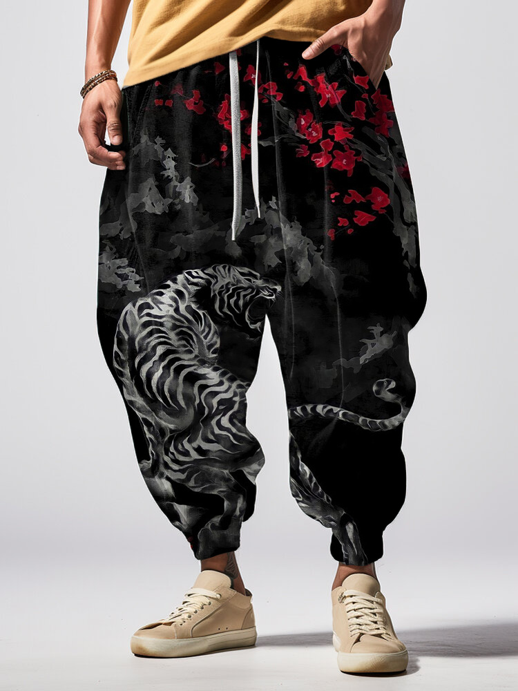 Men's Japanese Art Retro Tiger Print Loose Drawstring Waist Sweatpants