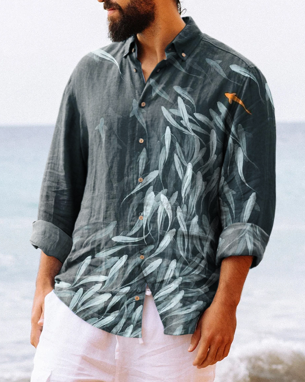 Men's Japanese Fish Print Button-down Long-sleeved Casual Shirt