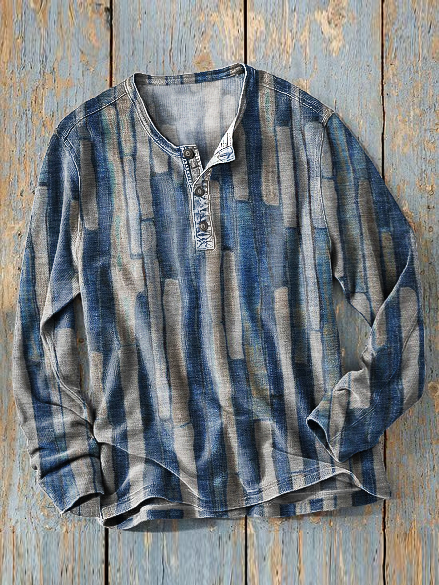 Men's Vintage Irregular Stripe Art Print Long Sleeve Henley Shirt