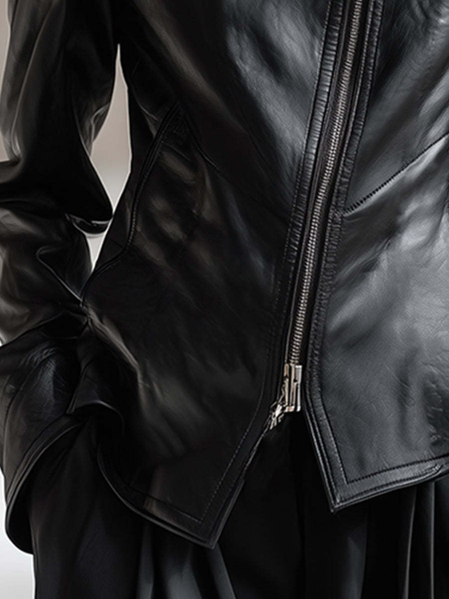 This edgy, stylish black PU jacket stands out with its high collar and distinctive diagonal zipper. The sleek design is crafted from premium PU leather, combining durability with a luxurious feel, ensuring style and comfort in all seasons.