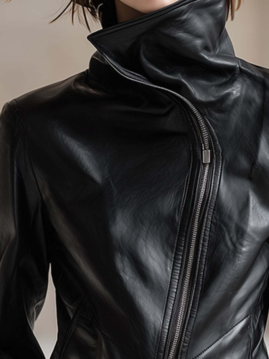 Personality And Fashion High Collar Oblique Zipper Black PU Jacket