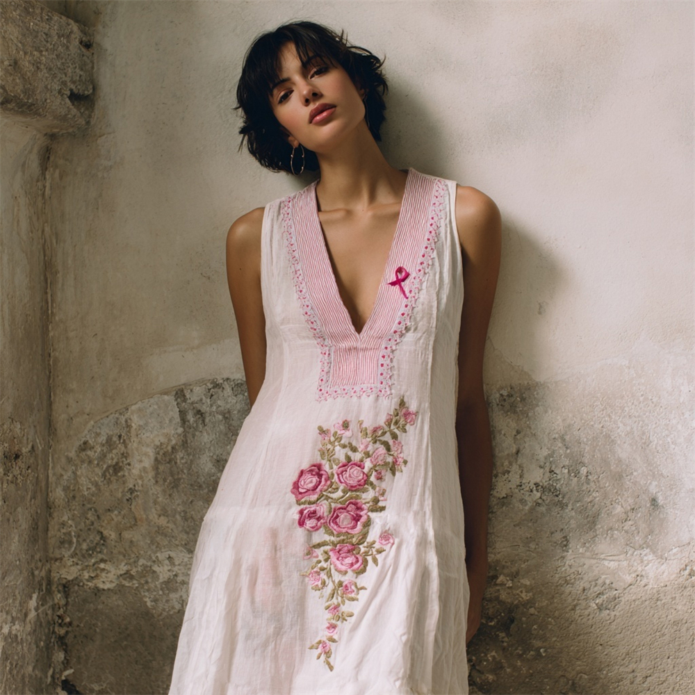 Pink Ribbon Boho Floral Embroidery Women's Linen Vest Midi Dress