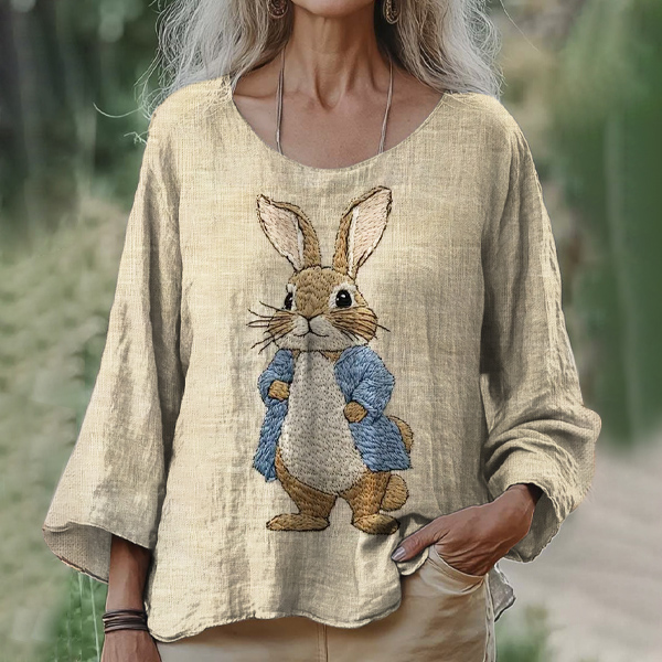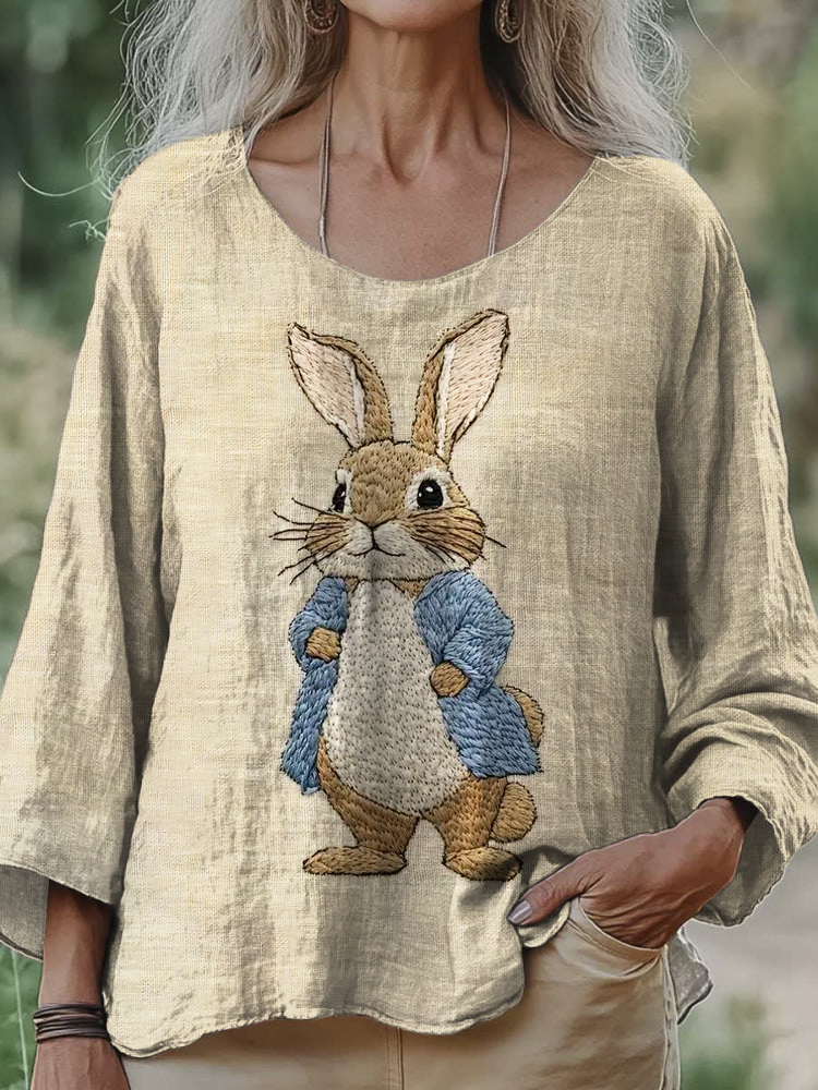 Rabbit Gentleman Animal Embroidery Women's Linen Loose Shirt