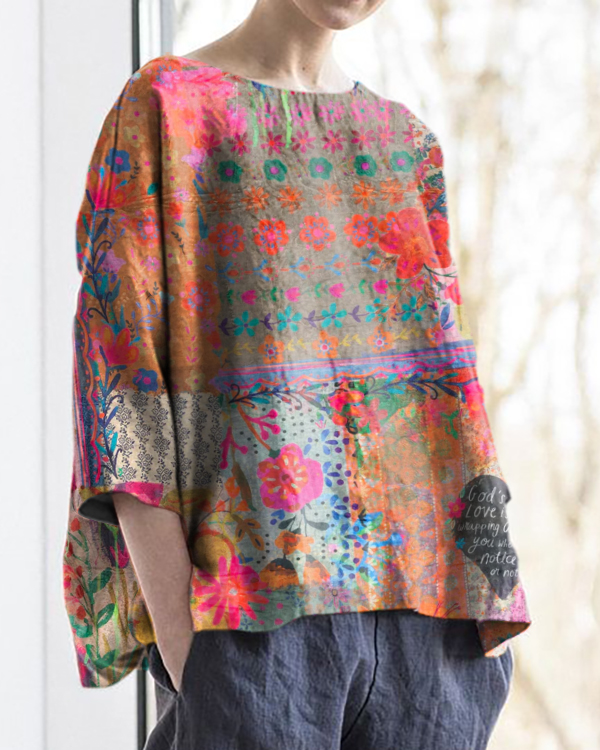 Retro Bohemian Floral Print Round Neck Cotton and Linen Loose Top