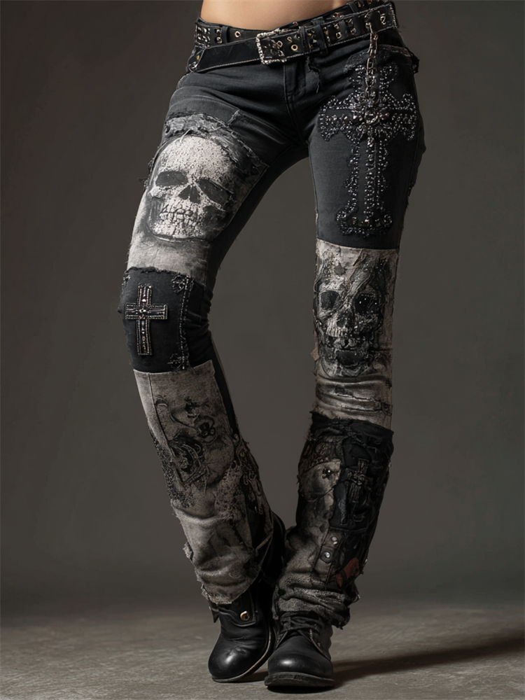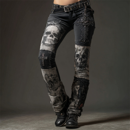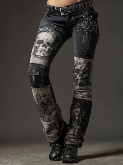 Rock Style Skulls & Cross Patchwork Studded Bootcut Jeans
