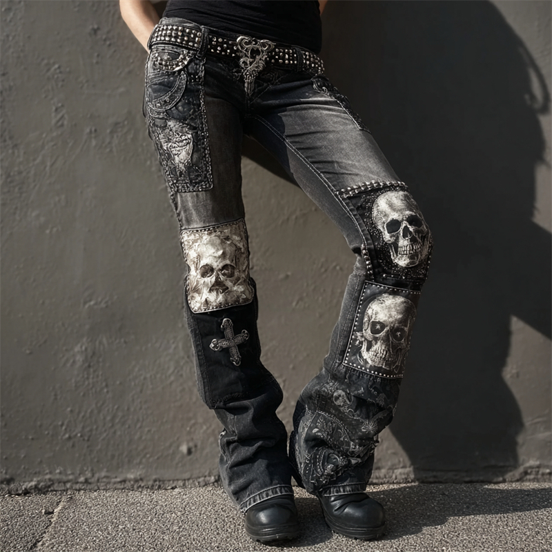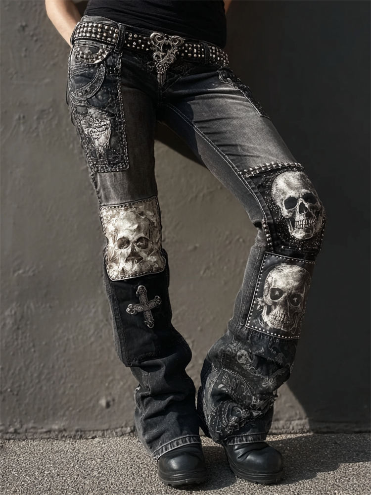 Rock Style Skulls & Cross Studded Patchwork Bootcut Jeans