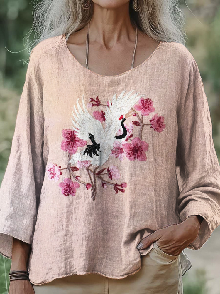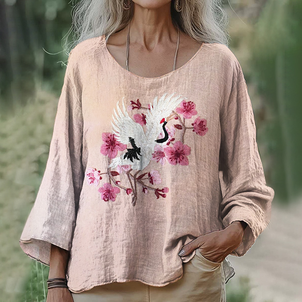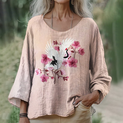Sakura & Crane Embroidered Women's Linen Loose Shirt