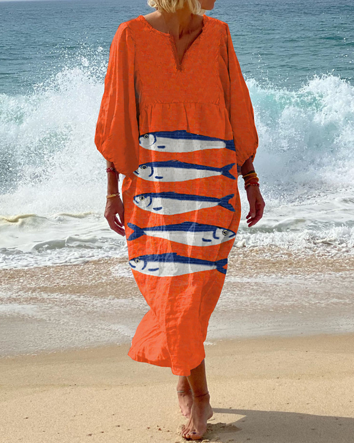Vacation Abstract Fish Art Print V-Neck Loose Dress