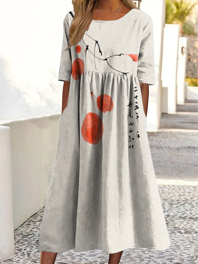 Vintage Art Print Crew Neck Pocket Midi Dress