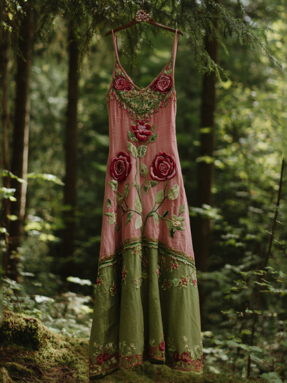 Vintage Classy Boho Gradient Pink Roses Embroidered Linen Suspender Dress
