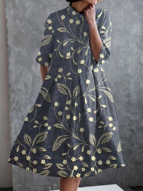 Vintage Embroidered Floral Print Casual Elegant Pocket Half Sleeve Dress