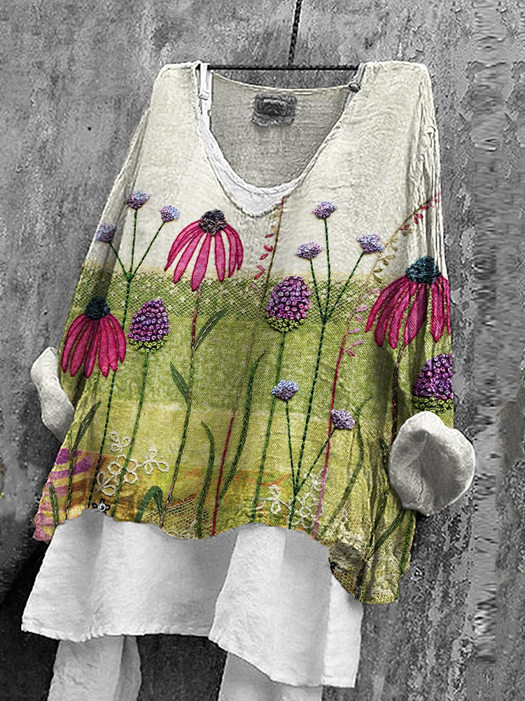 Vintage Floral Embroidered Linen Blend Cozy Women's Shirt
