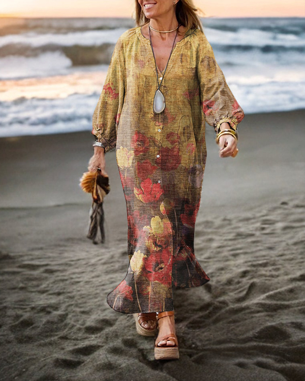 Vintage Floral Long Sleeve Cardigan Maxi Dress