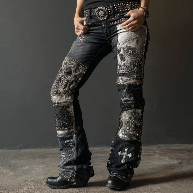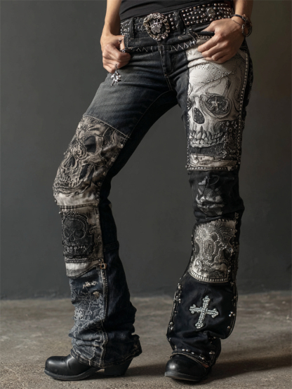 Vintage Rock Skulls & Cross Studded Patchwork Bootcut Jeans