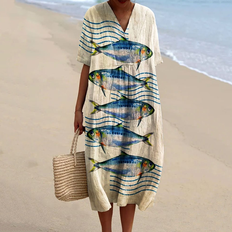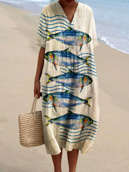 Vintage Sardines Fish Art Pattern Printed Women's Flowy Dress