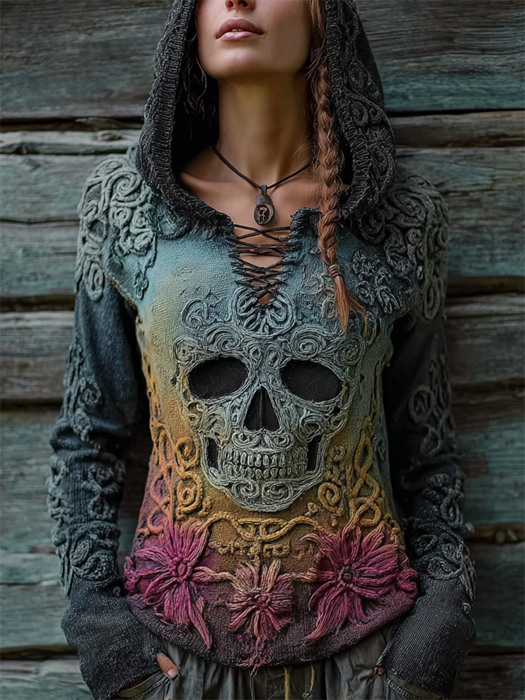 Vintage Skull Floral Gradient Celtic Knit Hooded Sweater