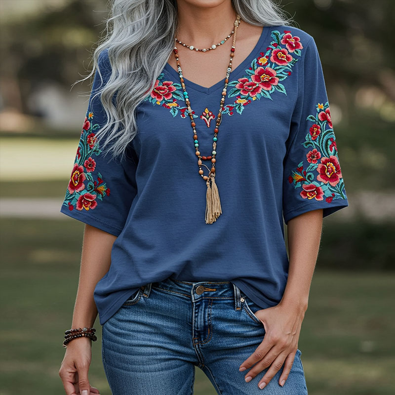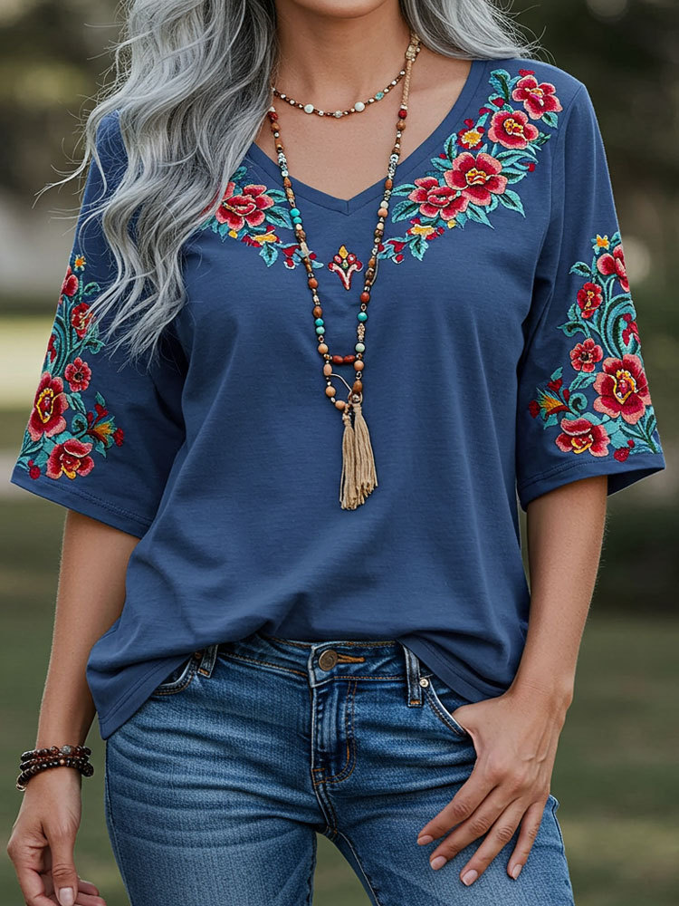 Women's Bohemia Ethnic Print Style Line Loose T-shirt