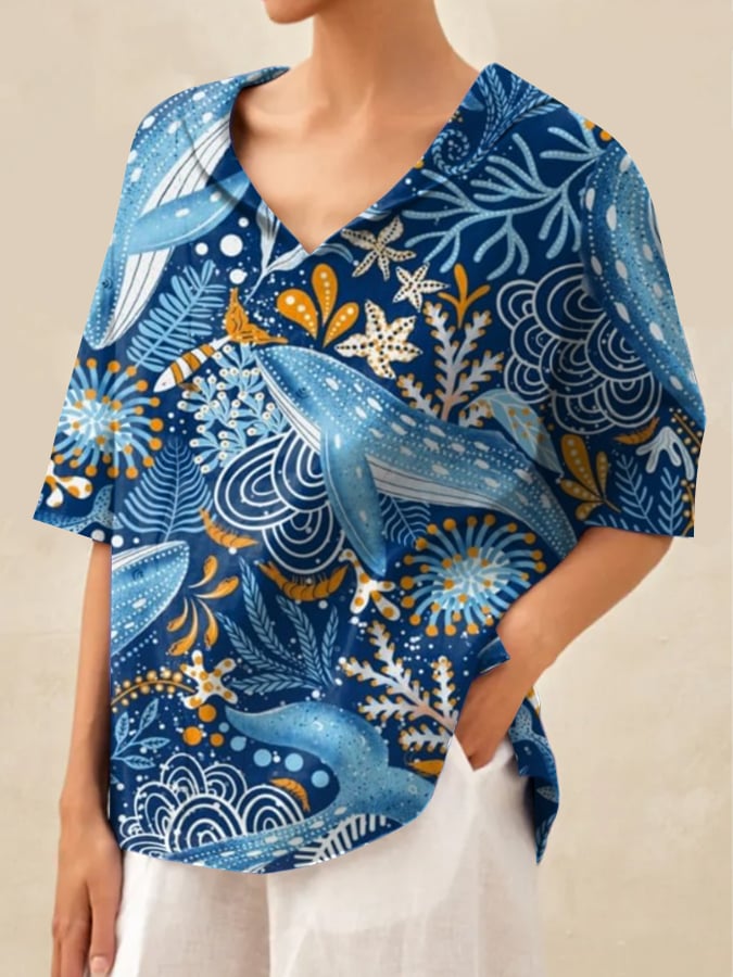 Women'S Botanical Floral Print Pattern Casual Linen V-Neck Shirt