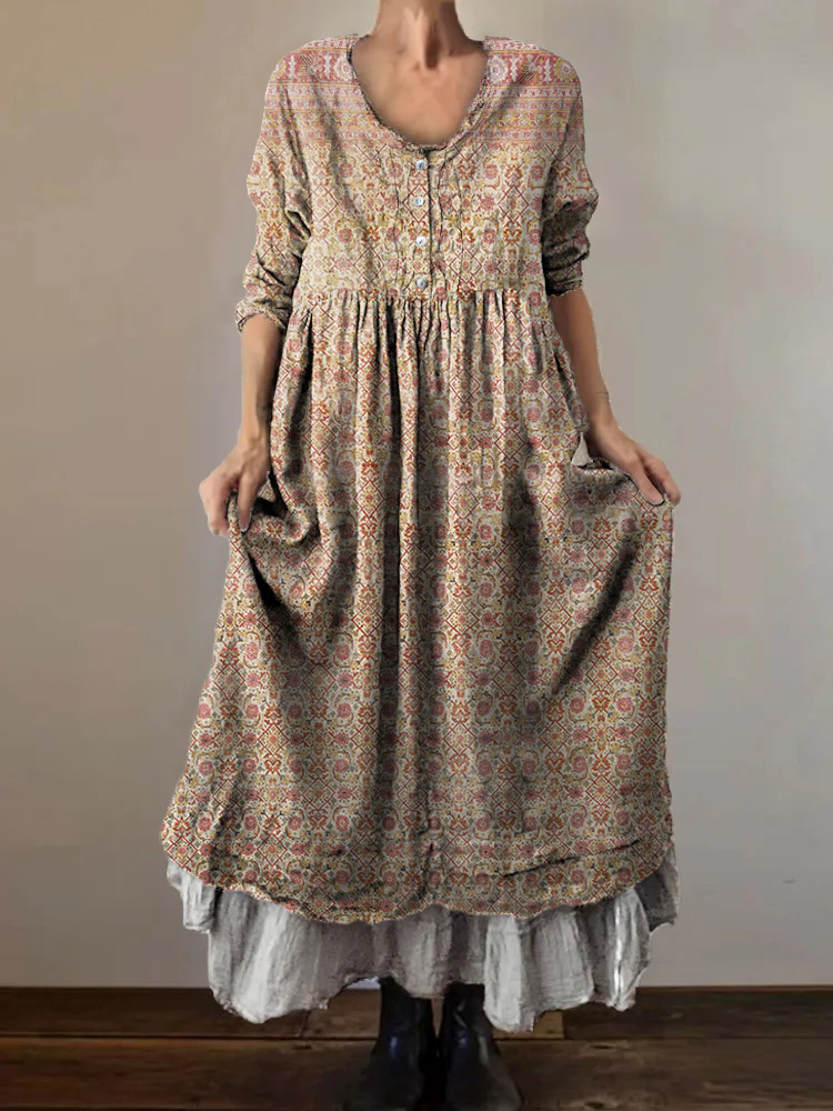 Women's Ethnic Tattoo Art Print V-Neck Button Pocket Cotton Dress