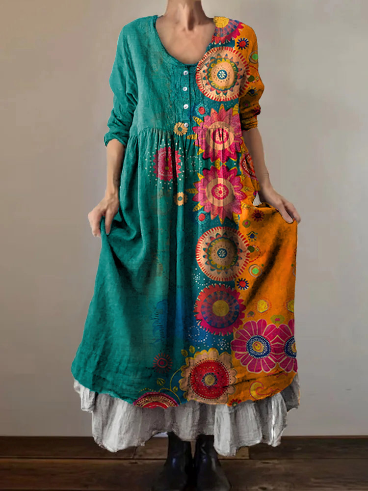 Women's Floral Art Print V-Neck Button Pocket Cotton Dress