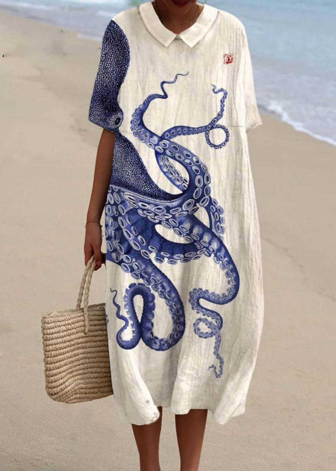 Women's Japanese Octopus Art Pocket Linen Dress(Convertible Dress With Front And Back Option)