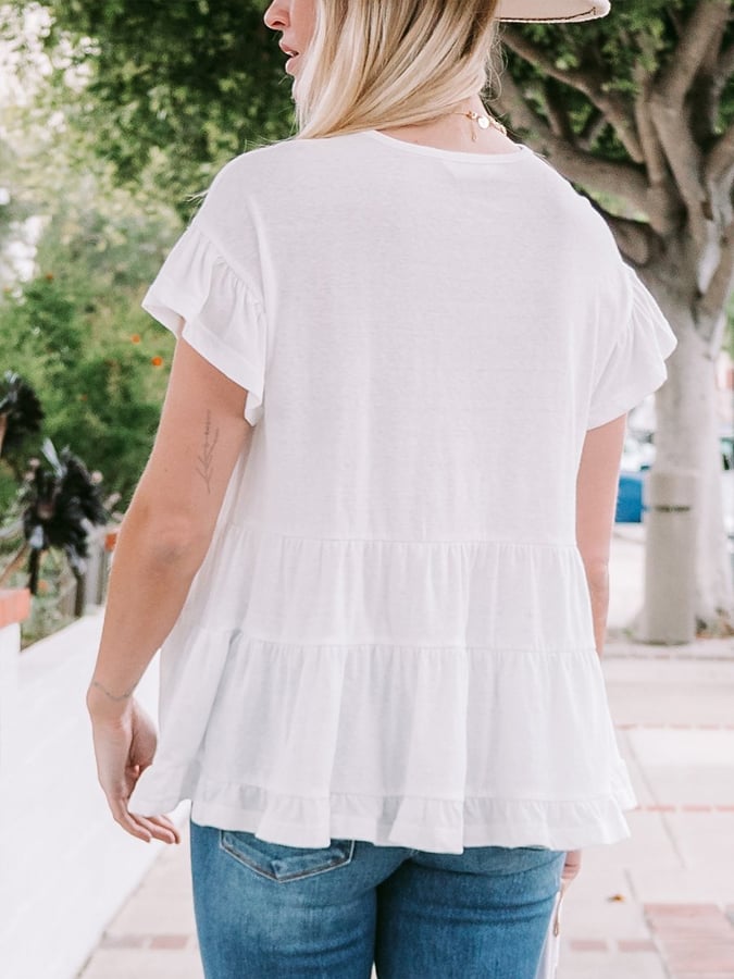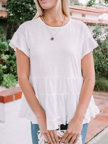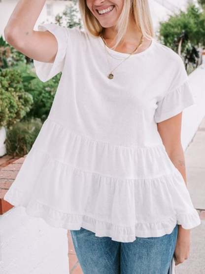 Women's Loose Linen O-Neck White Ruffle Tiered Swing Top