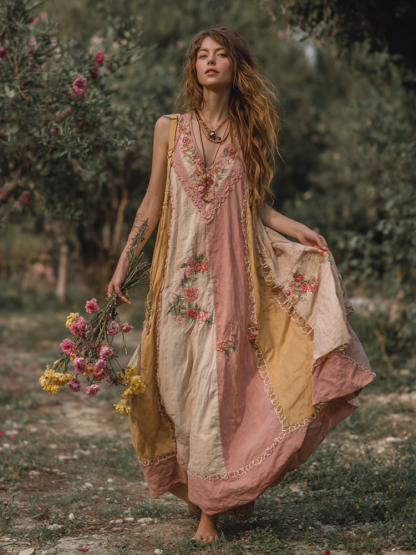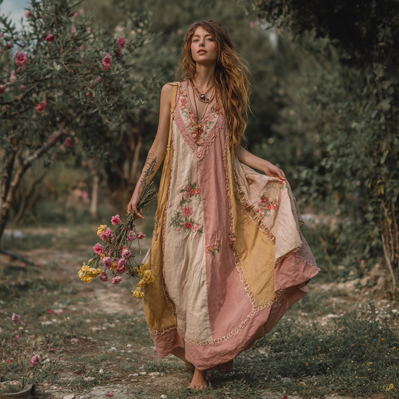 Women's Retro Bohemian Rose Pattern V-neck Dress