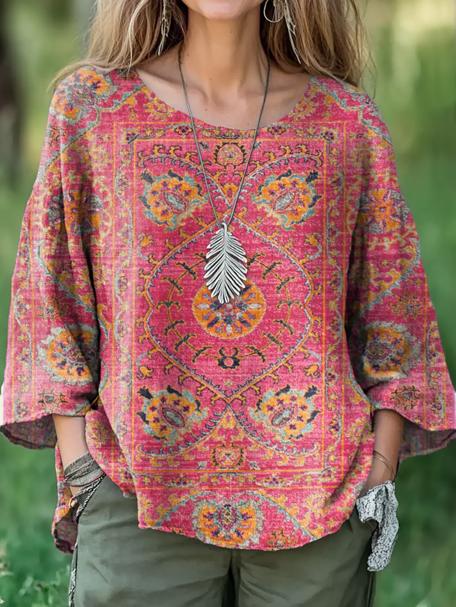 Women's Retro Floral Totem Print Casual Cotton And Linen Shirt