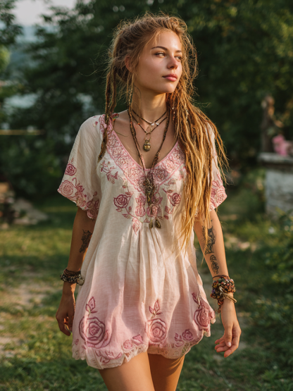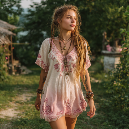 Women's Retro Pink Rose Gradient V-neck Dress