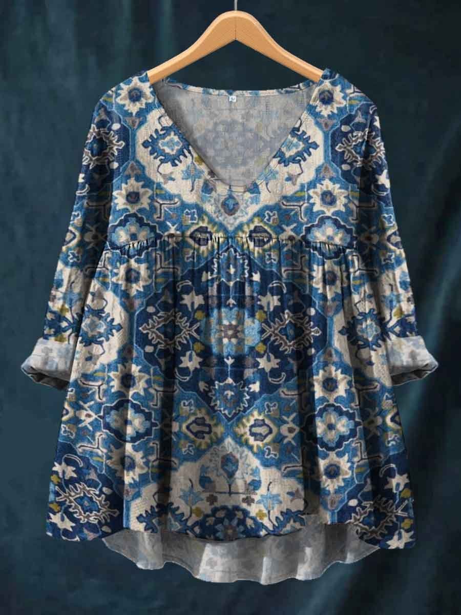 Women's V-neck Ethnic Geometric Printed Pleated Casual Comfort Cotton Shirt