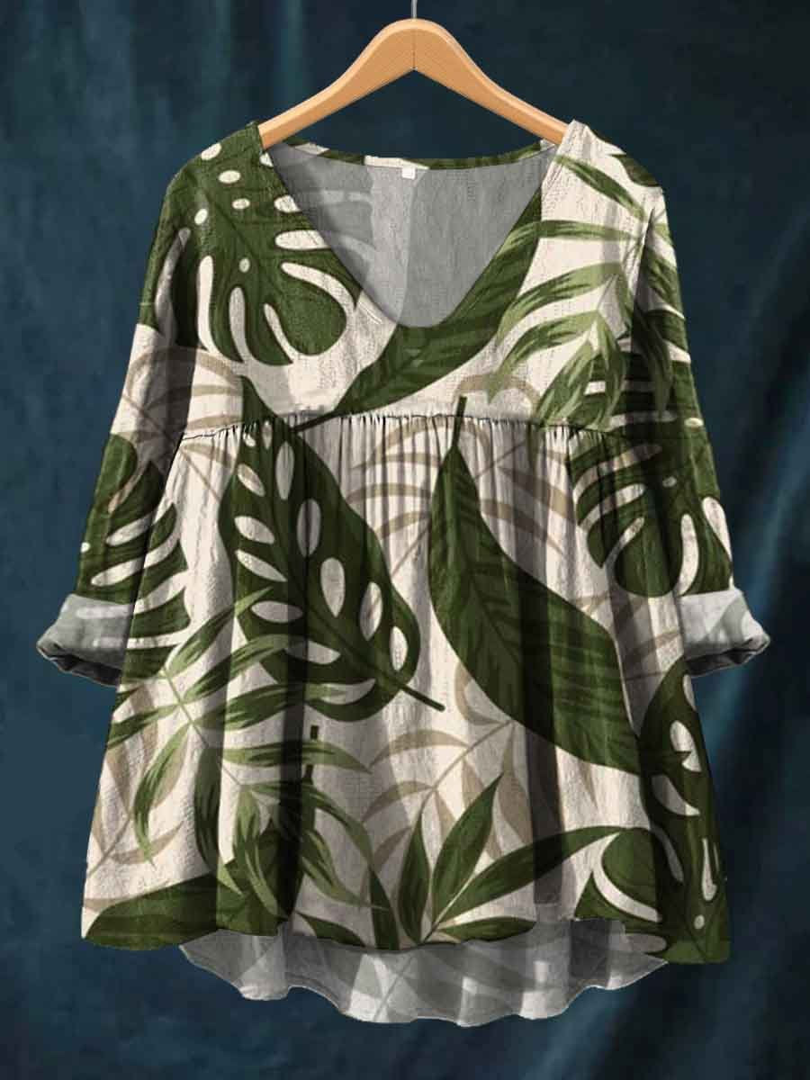 Women's V-neck Green Leaf Printed Pleated Casual Comfort Cotton Shirt