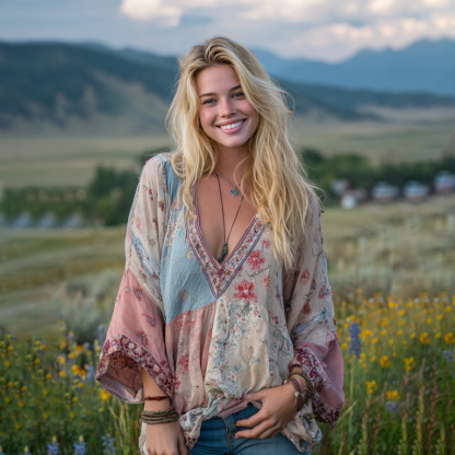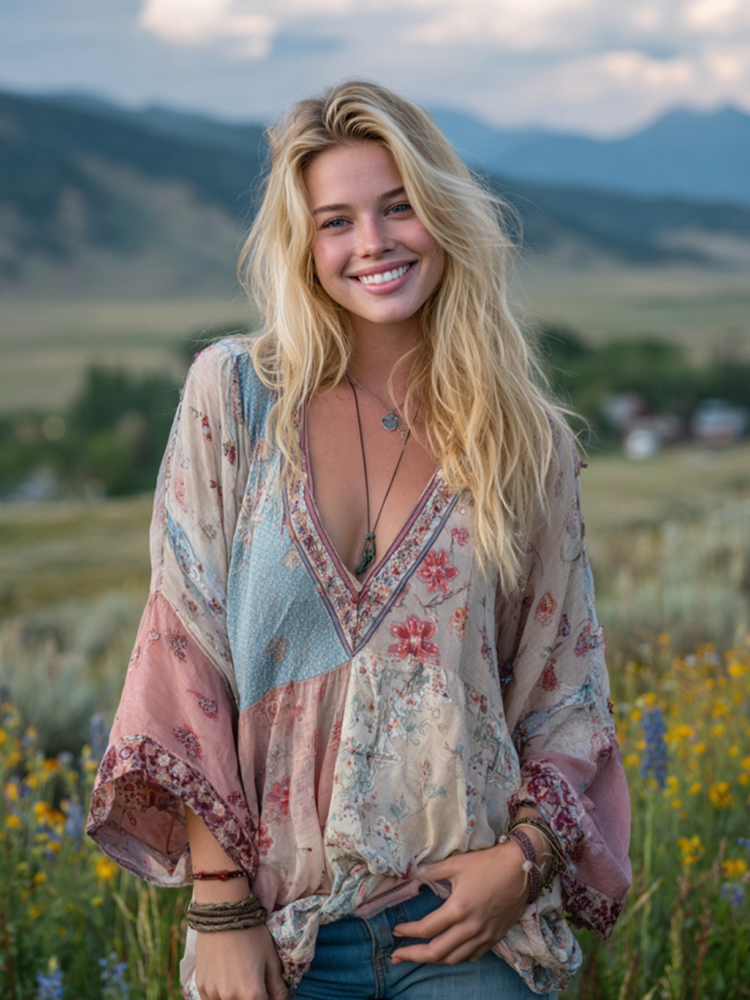Women's Vintage Floral Art Patch Cozy Linen Shirt