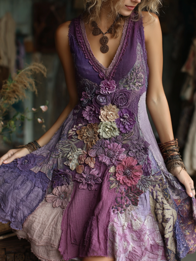 Women's Vintage Floral Splicing Cotton And Linen Tank Dress