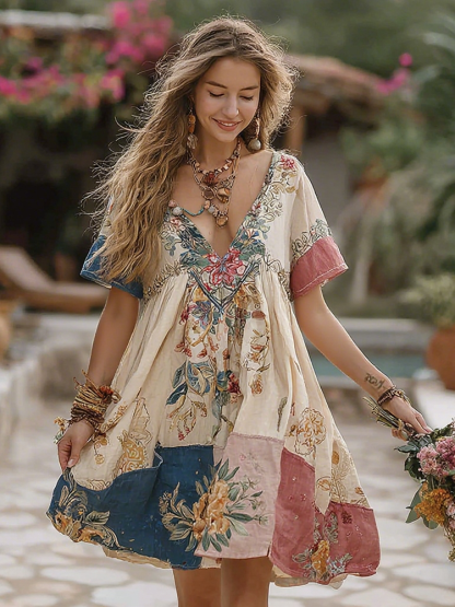 Women's Vintage Floral Stitching Cotton And Linen Dress
